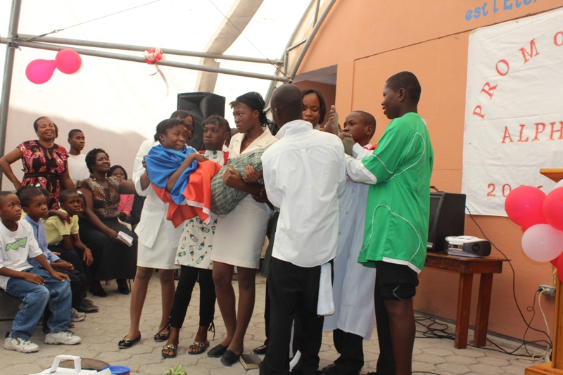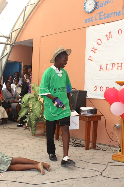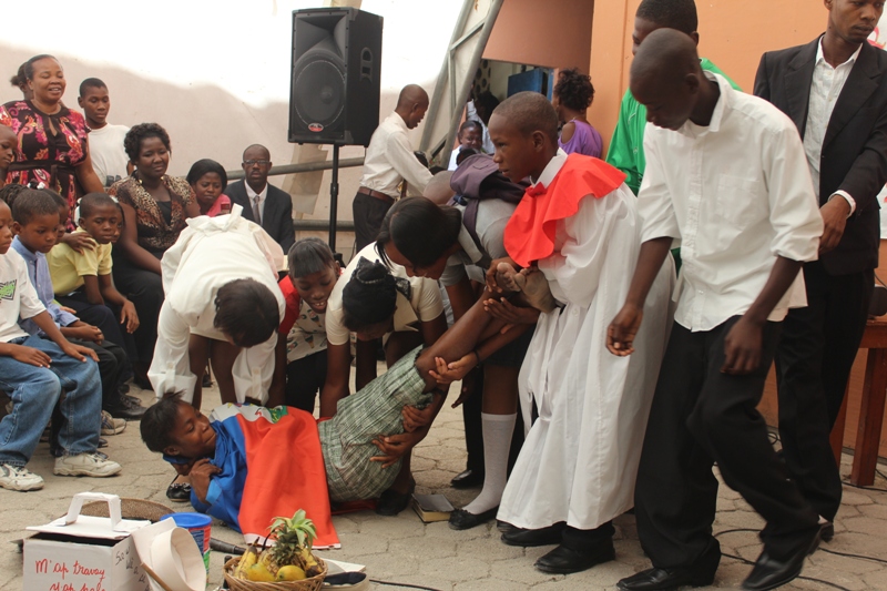 Recently at the Grade 6 graduation I had the privilege to watch some of the students perform a skit for the audience. It was really awesome to see the thought that went into this skit. The skit began with the one of the girls coming in draped in the Haitian flag. She collapses on the road, moaning and crying for help.