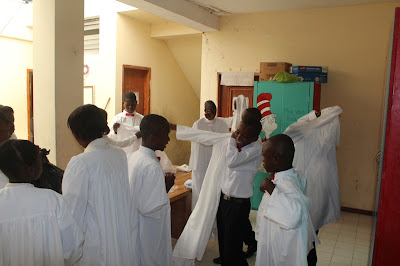 Giggles, loud laughter, singing, recitation, clapping, chatting, munching, and many other sounds were heard today as I observed and also sat in my office today. The noise was so loud at times that in some of the meetings we had upstairs we could barely hear each other talking. Today was the first day of VBS at the church at Adoration Christian Centre. There were some older ladies that had taken the time to organize a VBS week. They had many young people come and volunteer for the week. At 8:45 the children started to arrive at Adoration. By 9:30 we had over 100 children. By snack time there were at least 150 children there. If things progress like they did last year then by Friday we should have five times as many children there. Last year we started with 20 and ended with 100. Here are some pictures of today’s festivities.