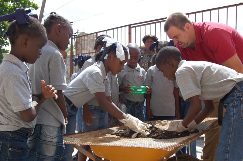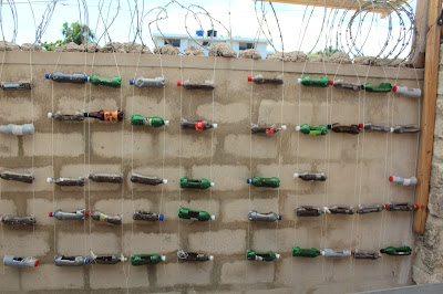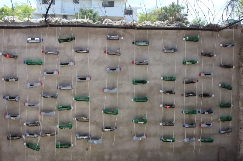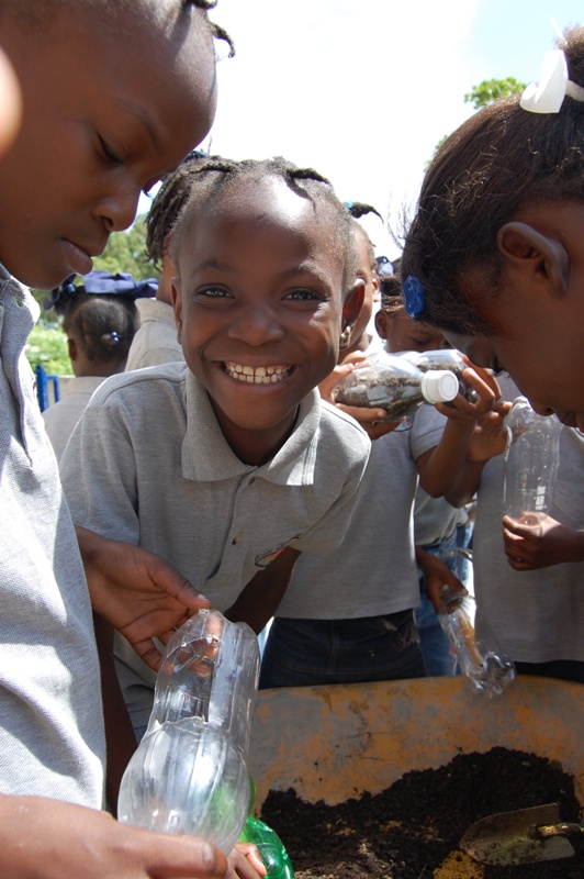 On Monday the whole school participated in making their own gardens. The students of the school were asked to bring in a plastic bottle. With the help of the teachers they cut a hole in the side of the container and then had drainage holes drilled in the bottom. Each grade got to mix their soil with fertilizer. Each student then picked the type of seed they wanted to put in the container. The containers were hung on the wall were the students can keep an eye on them to see if they are growing or not.
